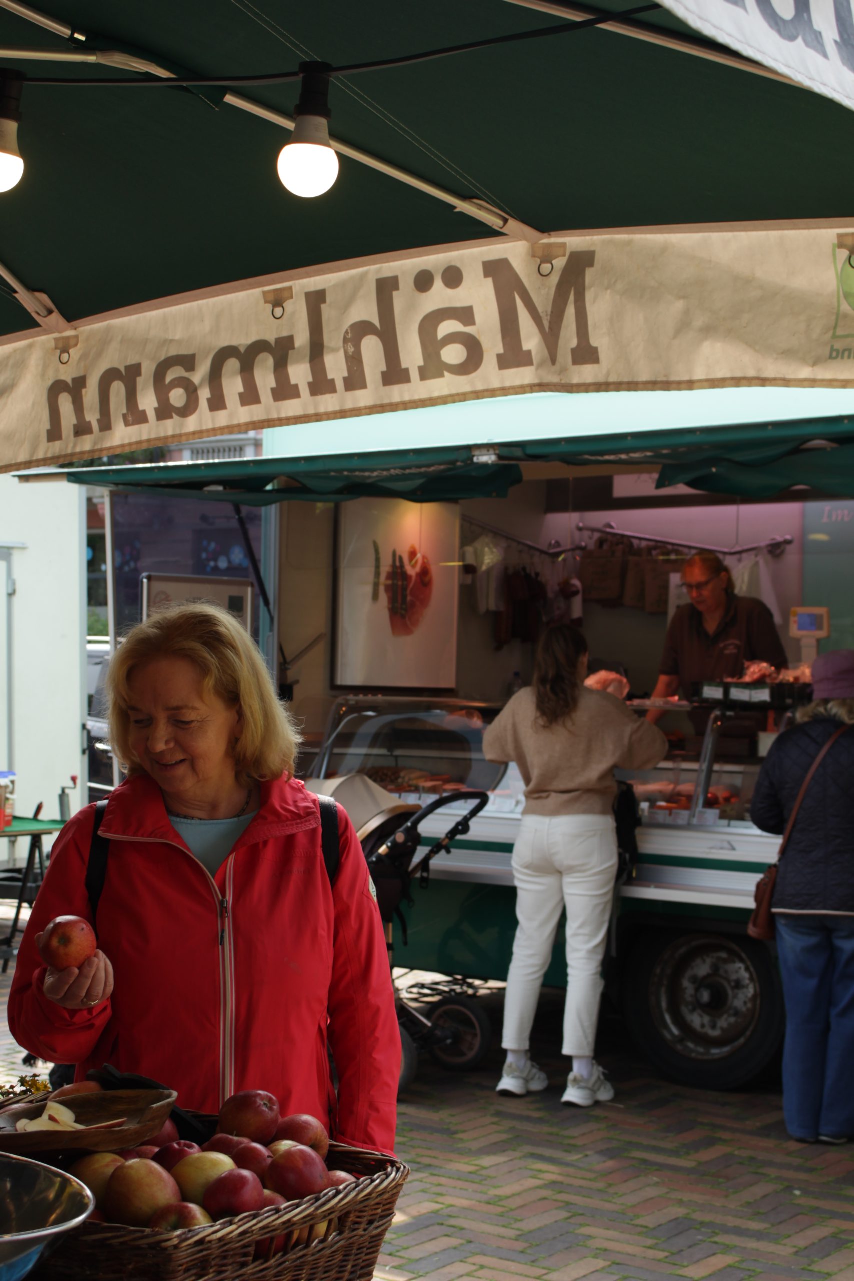 Anne Faika betrachtet einen Apfel des letzten Obststands auf ihrem Blankeneser Markts