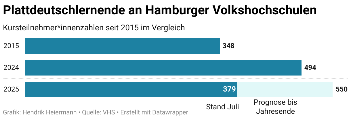 Wer nicht mehr zur Schule geht und trotzdem Plattdeutsch lernen will, hat eine weitere Option: die Volkshochschule (VHS). In Hamburg bietet diese aktuell 25 Plattdeutsch-Kurse auf verschiedenen Niveaus an, die in diesem Jahr bis jetzt 379 Teilnehmende anziehen. Dabei hat sich das Angebot in den letzten Jahren deutlich erweitert: 2015 gab es nur 25 Kurse, ausschließlich vor Ort, mit insgesamt 348 Teilnehmenden. Heute sind es doppelt so viele Kurse, davon etwa die Hälfte online, wodurch auch Plattdeutsch-Interessierte aus anderen Teilen Deutschlands erreicht werden.