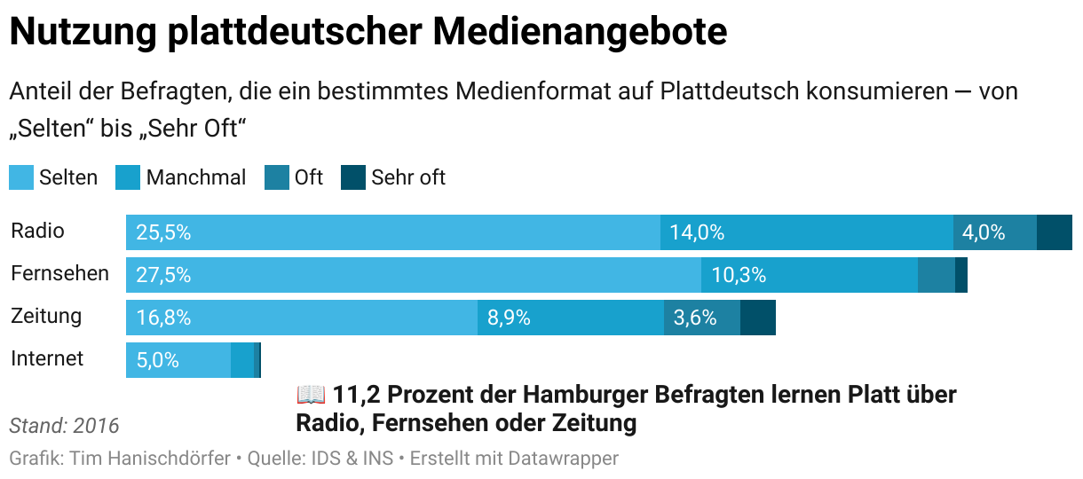 Damals spielte das Internet noch eine untergeordnete Rolle. Stattdessen war die plattdeutsche Medienlandschaft stark von traditionellen Medien geprägt: Radio und Fernsehen wurden von den Befragten am meisten genutzt, sie liegen damit vor dem Print-Bereich und auch klar vor dem Internet. 11,2 Prozent der Befragten aus Hamburg gaben bei der Erhebung 2016 an, Platt über Radio, Fernsehen oder Zeitung erlernt zu haben.