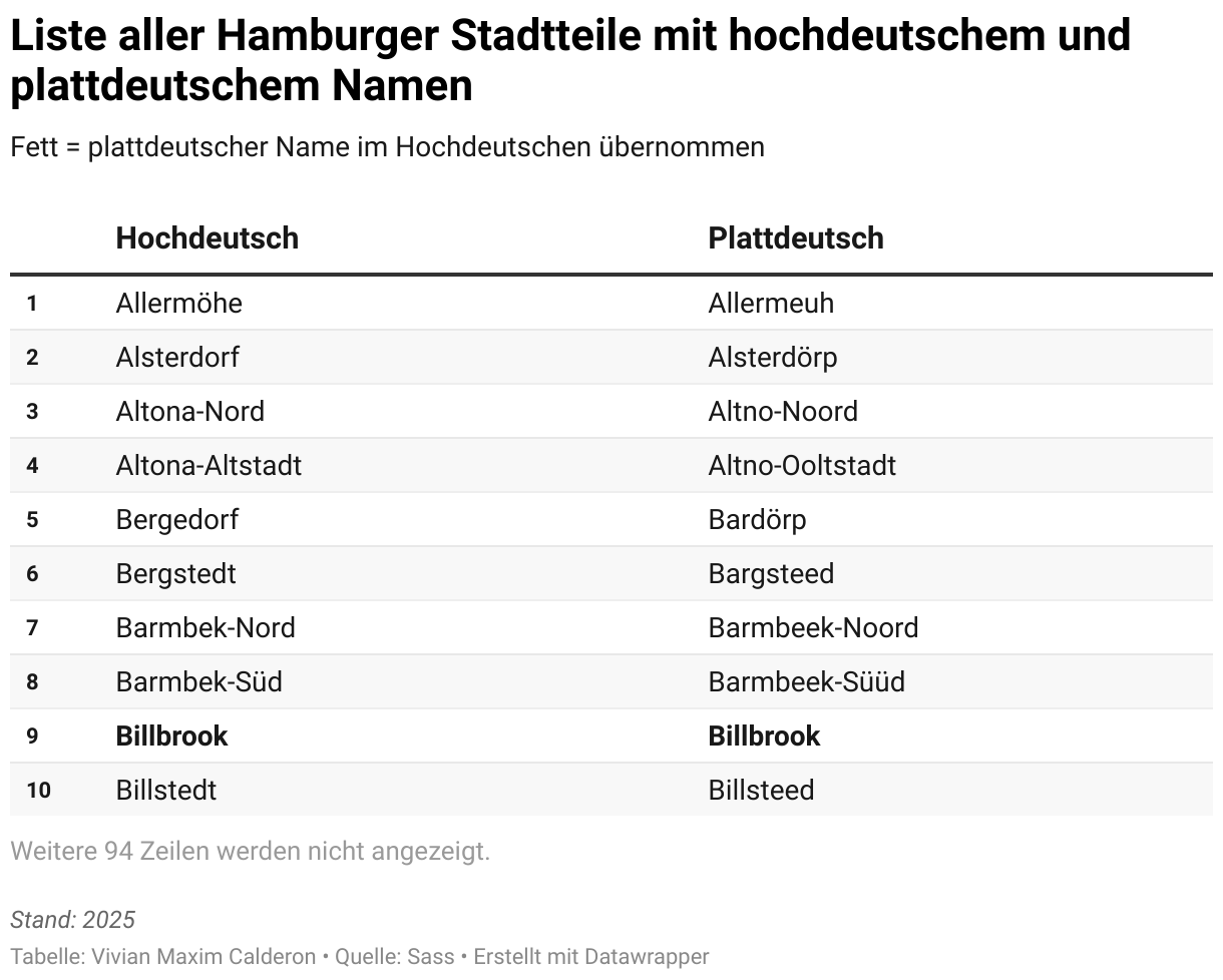 Doch gerade weil so viele Hamburger*innen die Sprache nicht aktiv sprechen, wird leicht übersehen: Plattdeutsch ist weiter fester Bestandteil des Hamburger Stadtbilds. Die Sprache findet sich nämlich nicht nur in Namen öffentlicher Orte wie dem der Parkanlage Planten un Blomen, sondern auch bei einigen Stadtteilen. So tragen 17 Stadtteile heute noch die Bezeichnung, die ihnen ursprünglich auf Plattdeutsch gegeben wurde. Viele andere wiederum tragen Namen, die in gewisser Form auf das Plattdeutsche zurückgehen. Dazu zählen beispielsweise Ottensen und Hammerbrook.