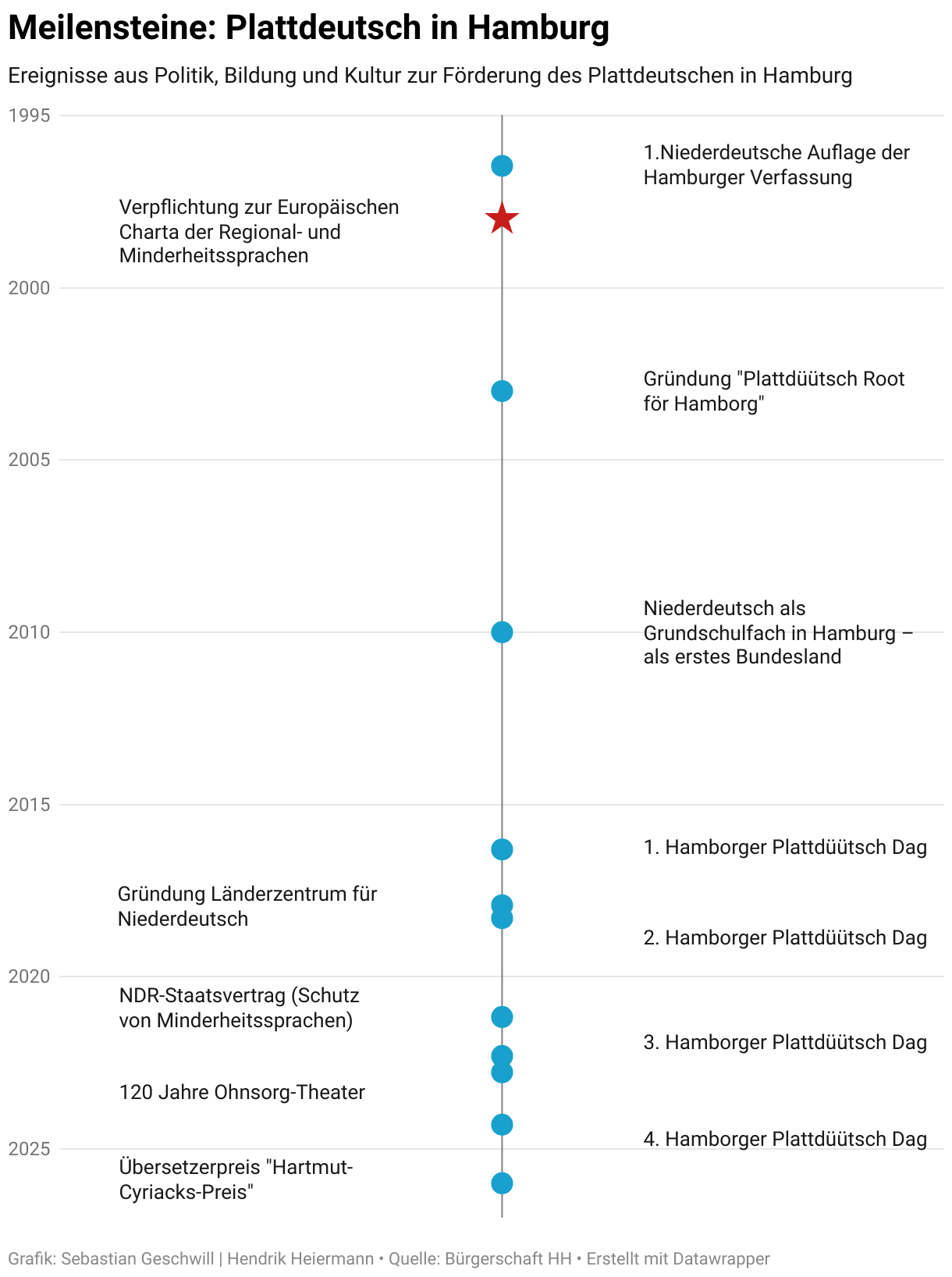 Dennoch zeigen die Daten, dass in Summe gerade einmal 9,5 Prozent der Befragten angaben, Platt gut oder sehr gut zu sprechen. So könnte man meinen, dass die Sprache von der Stadtkarte verschwindet. Um dem entgegenzuwirken, verschrieb sich Hamburg 1998 mit Unterzeichnung der Europäischen Charta der Regional- und Minderheitssprachen dazu, den Fortbestand des Plattdeutschen zu sichern: Der Hamburger Plattdeutsch-Tag wurde eingeführt, die Förderung von Bildungsmöglichkeiten in den Fokus gerückt und im NDR-Staatsvertrag verpflichten sich die Bundesländer Hamburg zum aktiven Erhalt des Niederdeutschen durch die öffentlich-rechtlichen Medien.