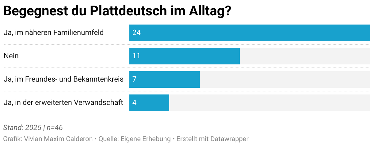 In einer weiteren Kategorie haben wir nach Begegnungen mit Plattdeutschem im Alltag gefragt. Die größte Gruppe der Befragten gibt an, im Alltag zumindest hin und wieder mit Plattdeutsch in Berührung zu kommen – meist im näheren Familienumfeld. Eltern und Großeltern sprechen oder sprachen Platt, wodurch die Sprache als Teil der persönlichen Geschichte weiterlebt. Zwar sprechen viele selbst kein Platt mehr, aber das gelegentliche Hören oder Verwenden einzelner Ausdrücke, etwa bei Familienfeiern oder in Redewendungen, scheint zur Weitergabe eines grundlegenden Verständnisses beizutragen.