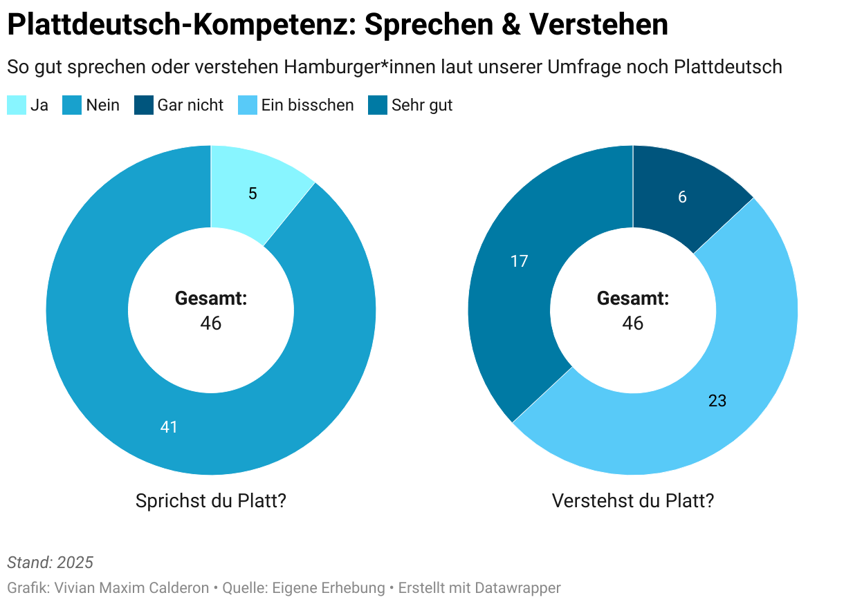„Dor is Hoppen un Molt verluren.” Ein Satz, wie man ihn vielleicht von den Großeltern kennt. Er klingt nach Tristesse, nach Landleben, nach einer anderen Zeit. Und nach einer Sprache, die mit 9,5 Prozent aktiven Sprecher*innen in Hamburg selbst fast „verluren” scheint: Plattdeutsch. Doch ist sie wirklich leiser geworden – oder überhören wir sie nur? FINK.HAMBURG hat Daten analysiert und nachgeforscht, wie die Sprache in Hamburg gefördert wird und wo sie heute noch das Stadtbild prägt.