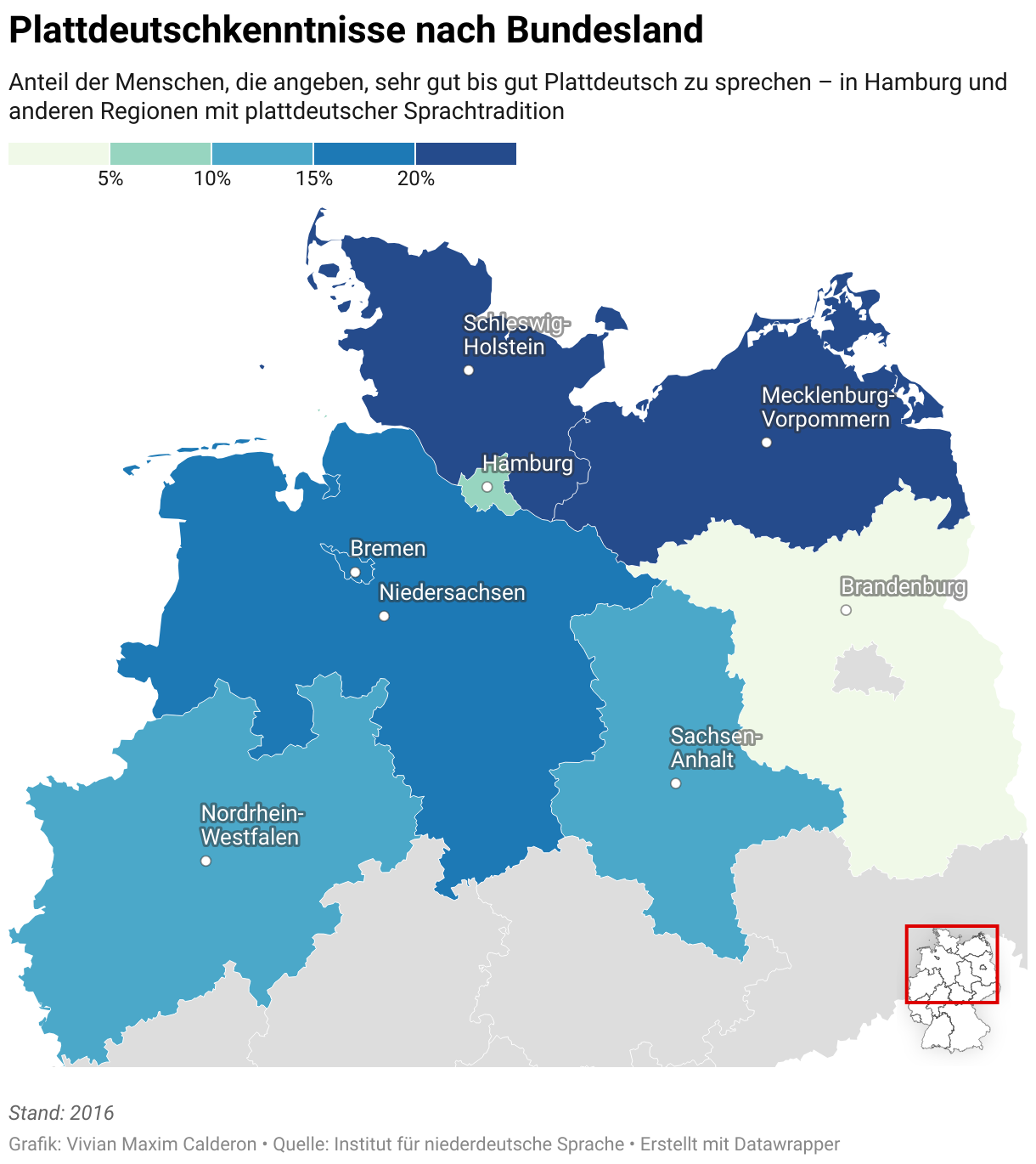 Innerhalb des Plattdeutschen existieren zahlreiche regionale Varianten. Eine davon, das Hamburgische, hat sich „zu einem vereinfachten Dialekt entwickelt“, sagt Börnsen. Ob Platt in Hamburg dafür umso häufiger gesprochen wird? Ein Blick auf die letzte systematische Erhebung von 2016 zeigt: In der Hansestadt wird deutlich weniger Platt gesprochen als in vielen anderen Teilen Norddeutschlands. Im Vergleich zu beispielsweise Schleswig-Holstein oder Niedersachsen fällt der Stadtstaat damit deutlich ab.