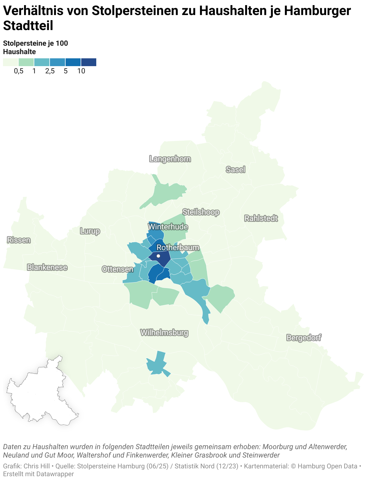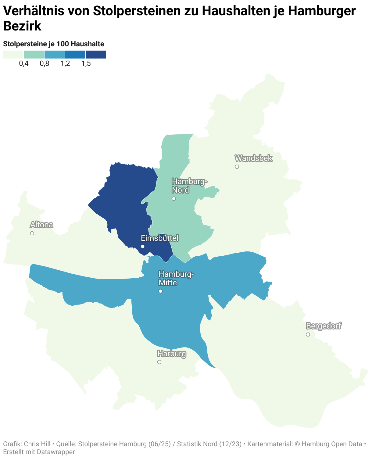 Ein Blick auf die Verteilung der Stolpersteine in Hamburgs Stadtteilen zeigt, dass die Stolpersteine bisher vor allem im Zentrum liegen. Auch bedingt dadurch, dass die Stolperstein-Initiative in Hamburg die ersten aussagekräftigen Daten aus Eimsbüttel bekam. Zum anderen aber auch an der jüdisch geprägten Geschichte durch das Grindelviertel in Eimsbüttel.