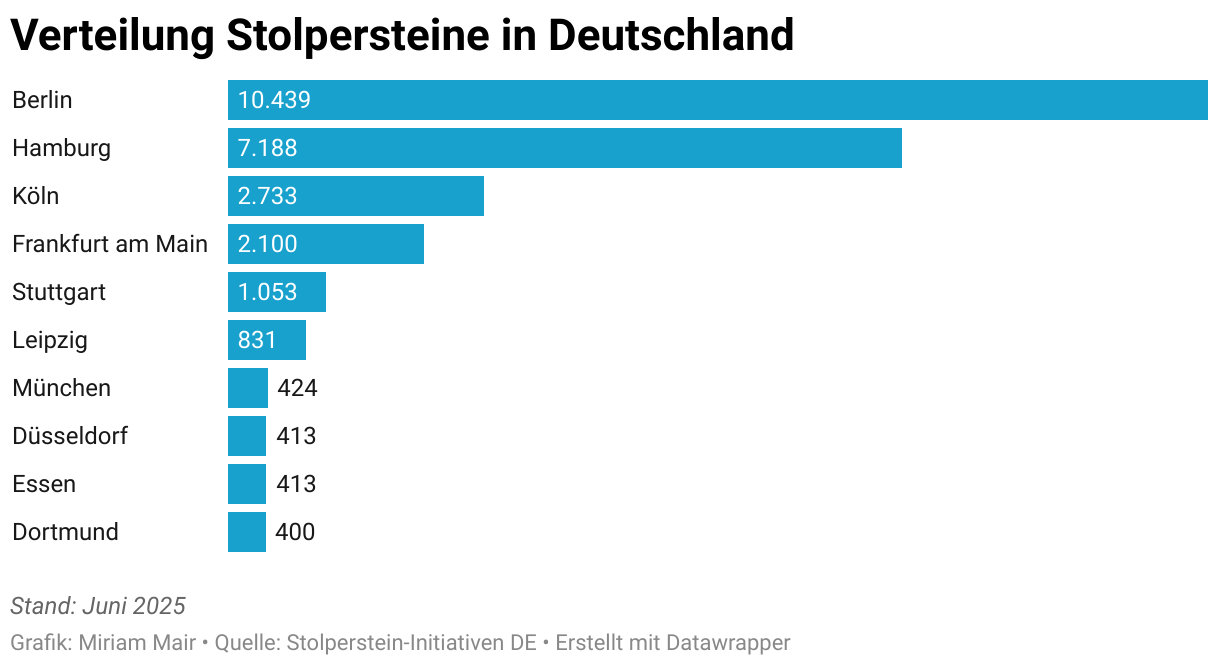 Das Projekt von Hess ist sehr erfolgreich. Bis vor vier Jahren war Hamburg die Stadt mit den meisten Stolpersteinen. Mittlerweile ist es Berlin.
