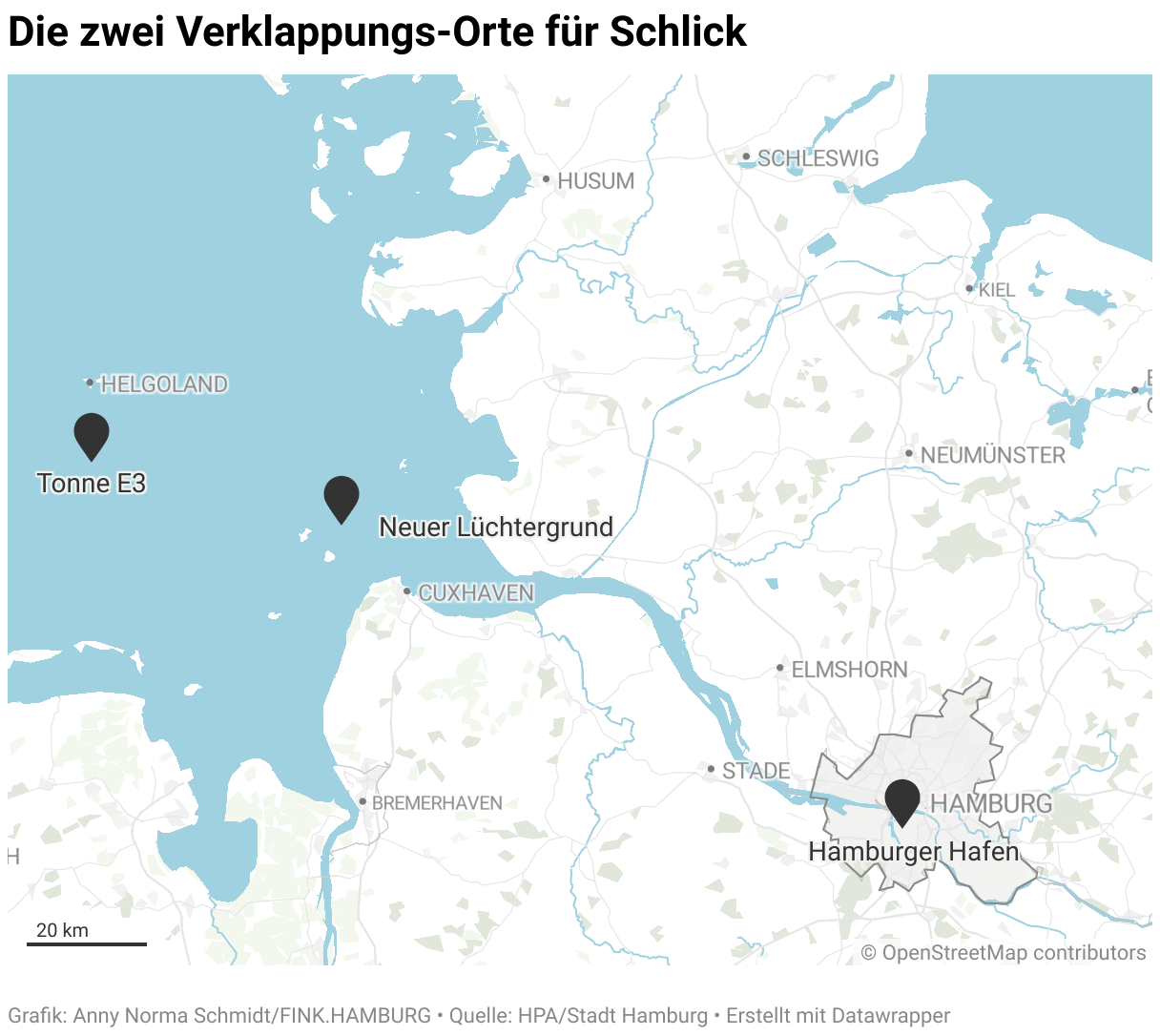 Denn im besten Fall soll der Schlick in die Nähe der Tonne E3 vor Helgoland gekippt werden. Die Navigations-Tonne E3 liegt vor der Insel Helgoland und damit mitten in der Nordsee. Dort ist die Wahrscheinlichkeit höher, dass der extra abgebaggerte Schlick nicht wieder in die Elbe und schließlich in den Hafen zurückgelangt. Vor allem aber ist dort der geschützte Nationalpark Wattenmeer wenig betroffen von den teilweise hochbelasteten Schlick-Sedimenten. Aus diesen Gründen vereinbarten Hamburg und Schleswig-Holstein 2022, dort vermehrt den Schlick abzukippen. Sie hielten ihre Abmachung in einem Eckpunktepapier fest. Darin legen die Länder fest, dass nach dem Auslaufen ihres alten Abkommens sie weiterhin zusammenarbeiten wollen und für die nächsten zehn Jahre den Schlick auptsächlich an Tonne E3 kippen.