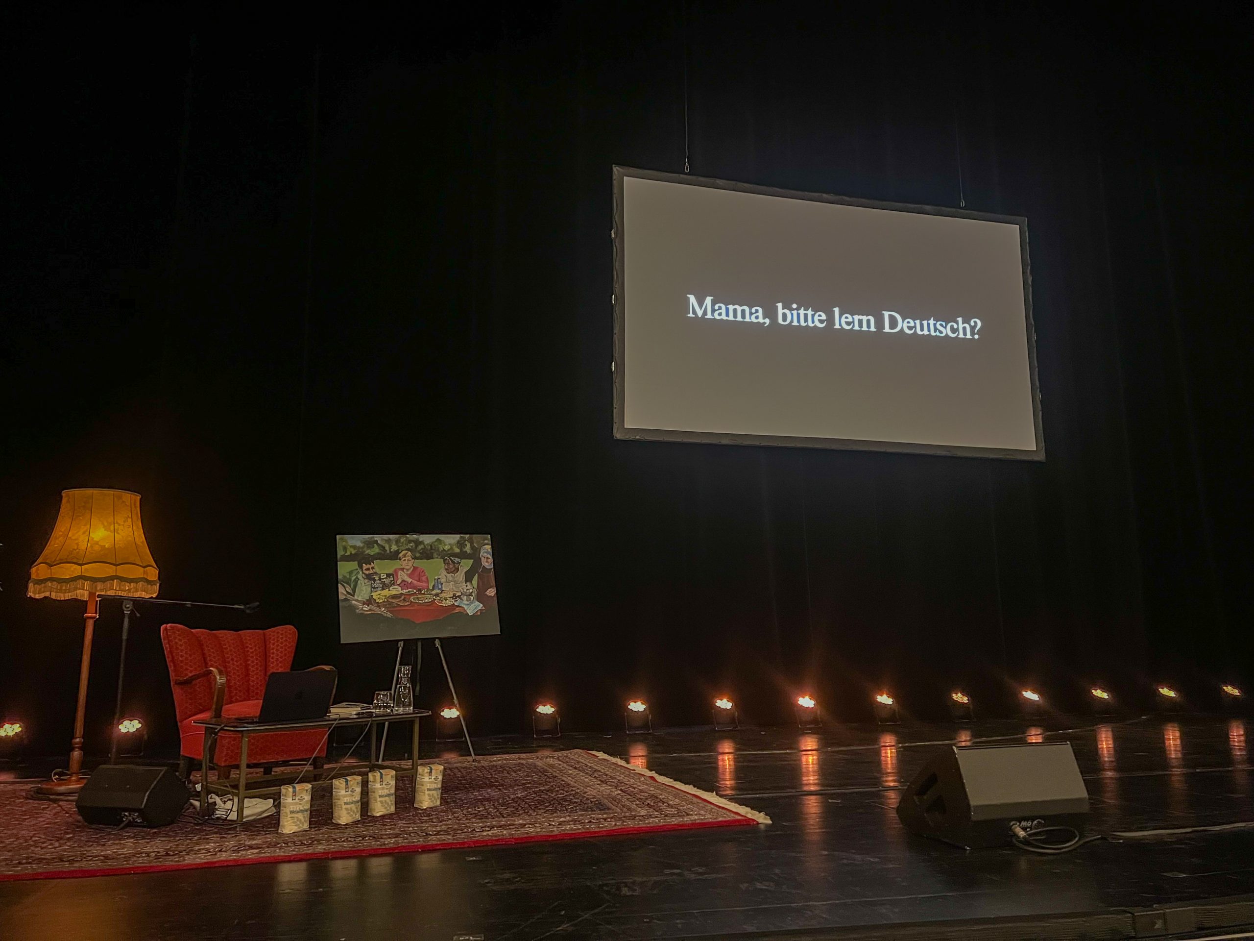 Bühnenbild von Tahsim Durgun. Eine Leinwand mit dem Titel des Buches und dem Bühnenbild.