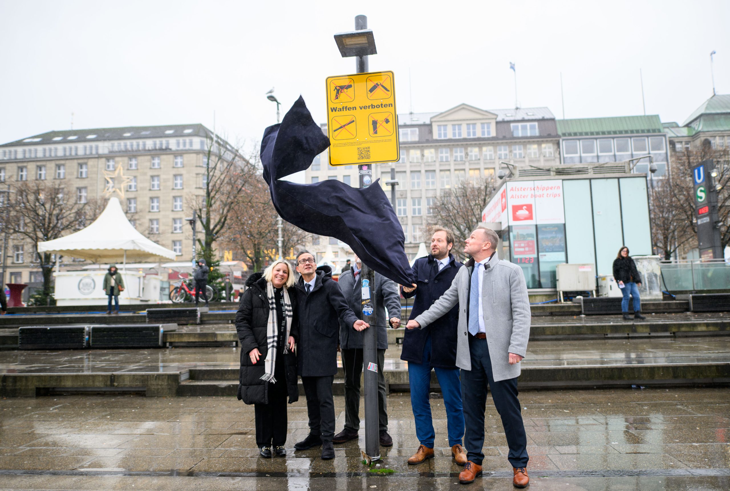 Hier wird ein Schild zum Waffenverbot auf der Reeperbahn gelüftet. Foto: Daniel Reinhardt/dpa