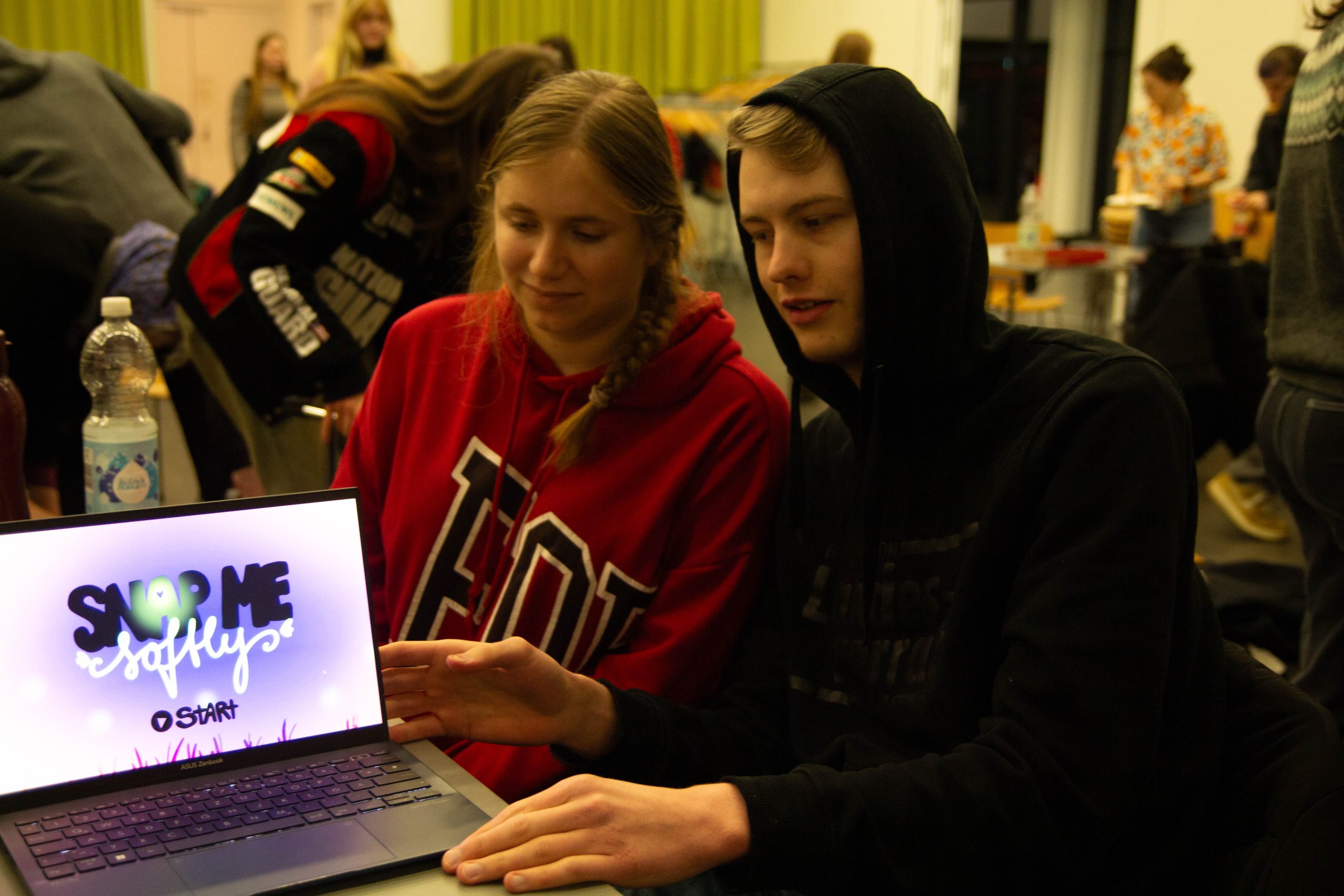 Zwei Personen schauen zeigen ihren Bildschirm auf dem das Gewinnerspiel zu sehen ist.