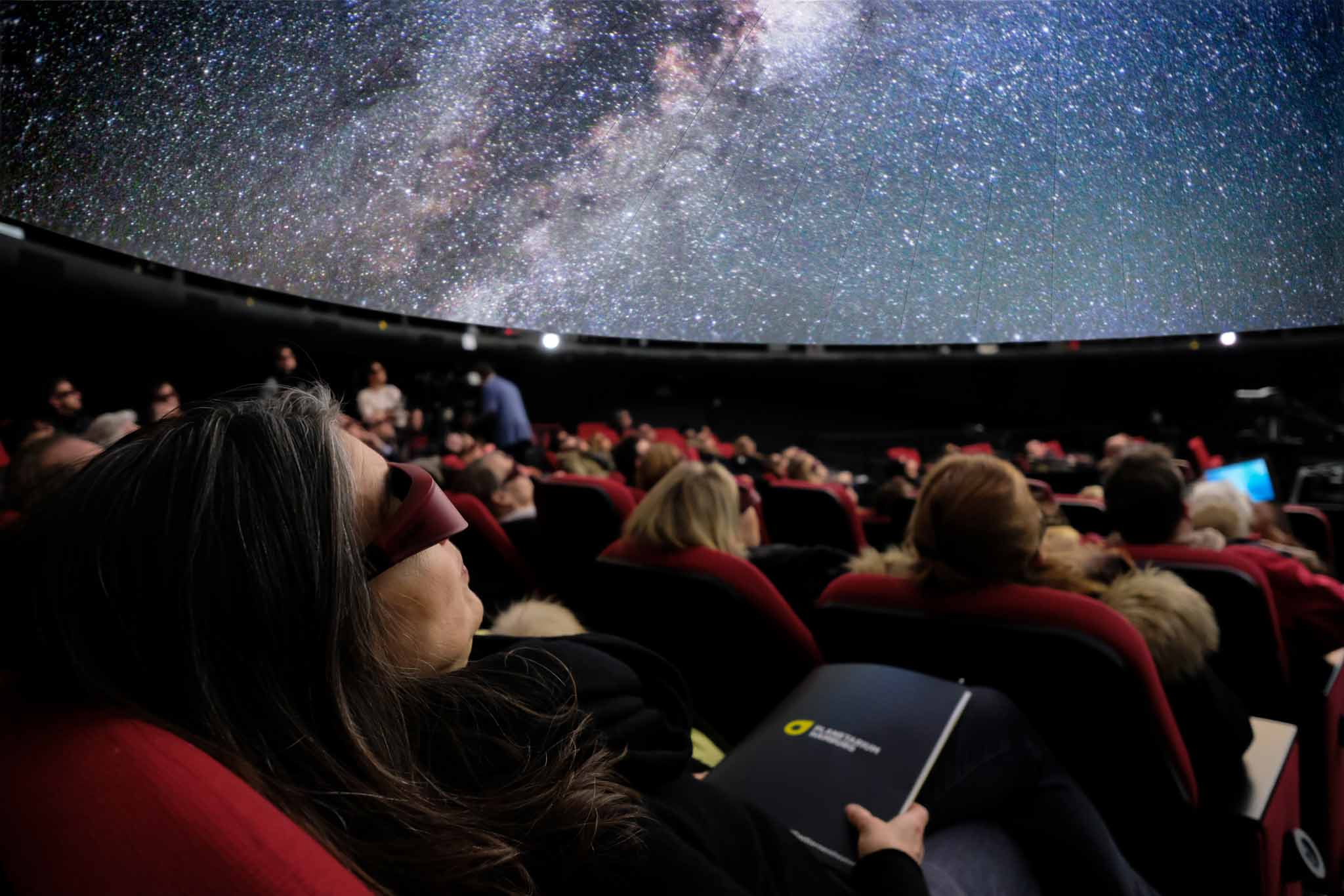 Das Planetarium im Stadtpark ist hell beleuchtet und schon von Weitem sichtbar. Im Inneren ist der große Sternensaal zu etwa einem Drittel gefüllt. Auf der Kuppel bewegen sich bunte Formen, Illustrationen und animierte Gebäude. Dazu hört man Musik, intensiven Sound und auch gesprochenen Text. Der Name dieser Show: „MindSpace“.
