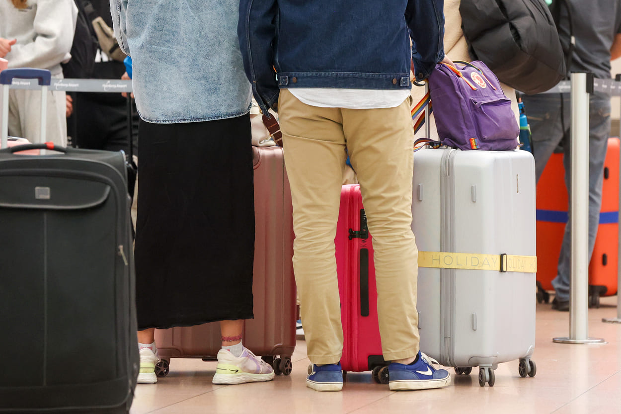 Auf dem Bild sind zwei stehende Menschen mit Rollkoffern zu sehen.