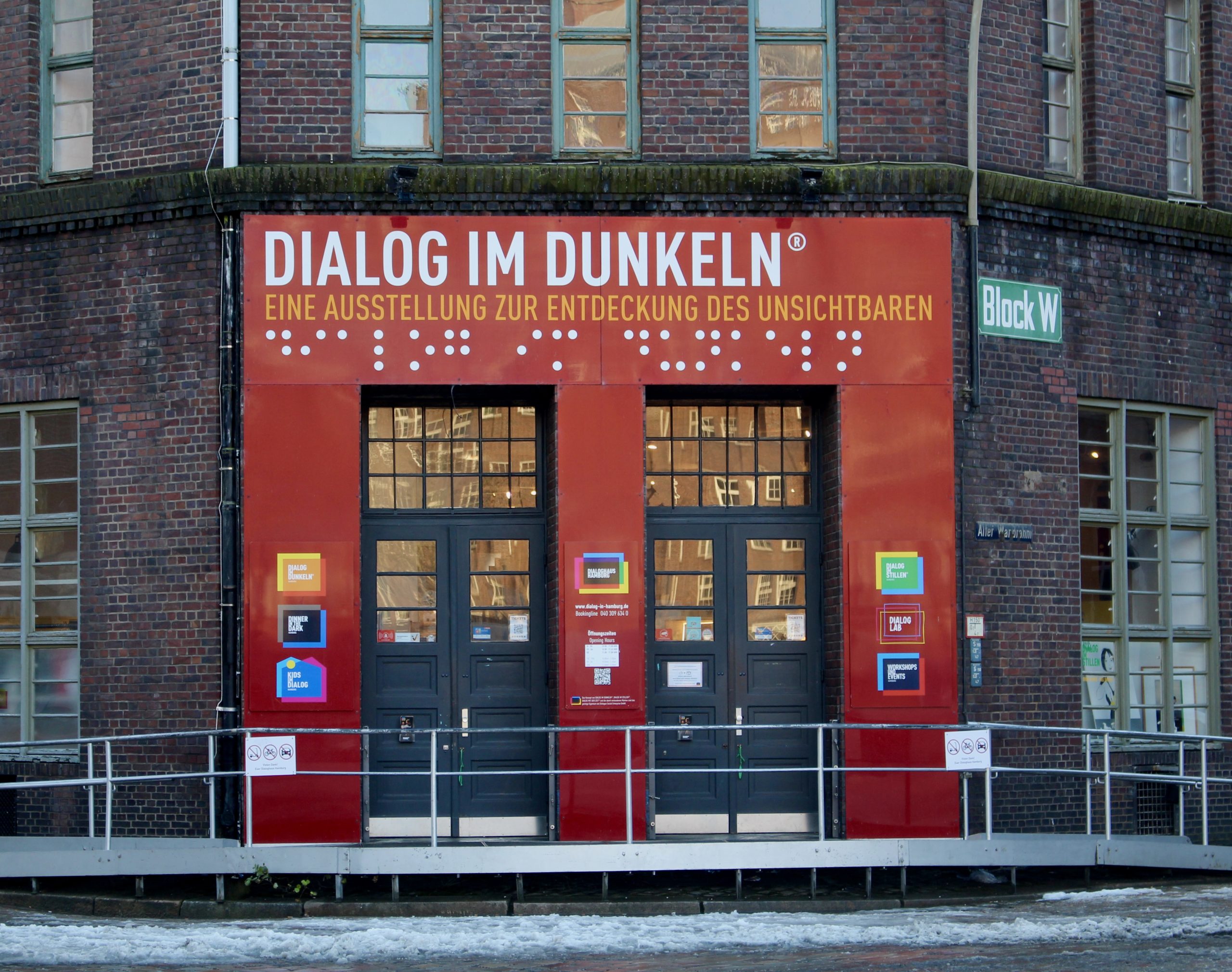 Der Eingang des Dialoghauses mit dem Schriftzug Dialog im Dunkeln. Darunter nochmal in Blindenschrift. Darunter die Eingangstüren.
