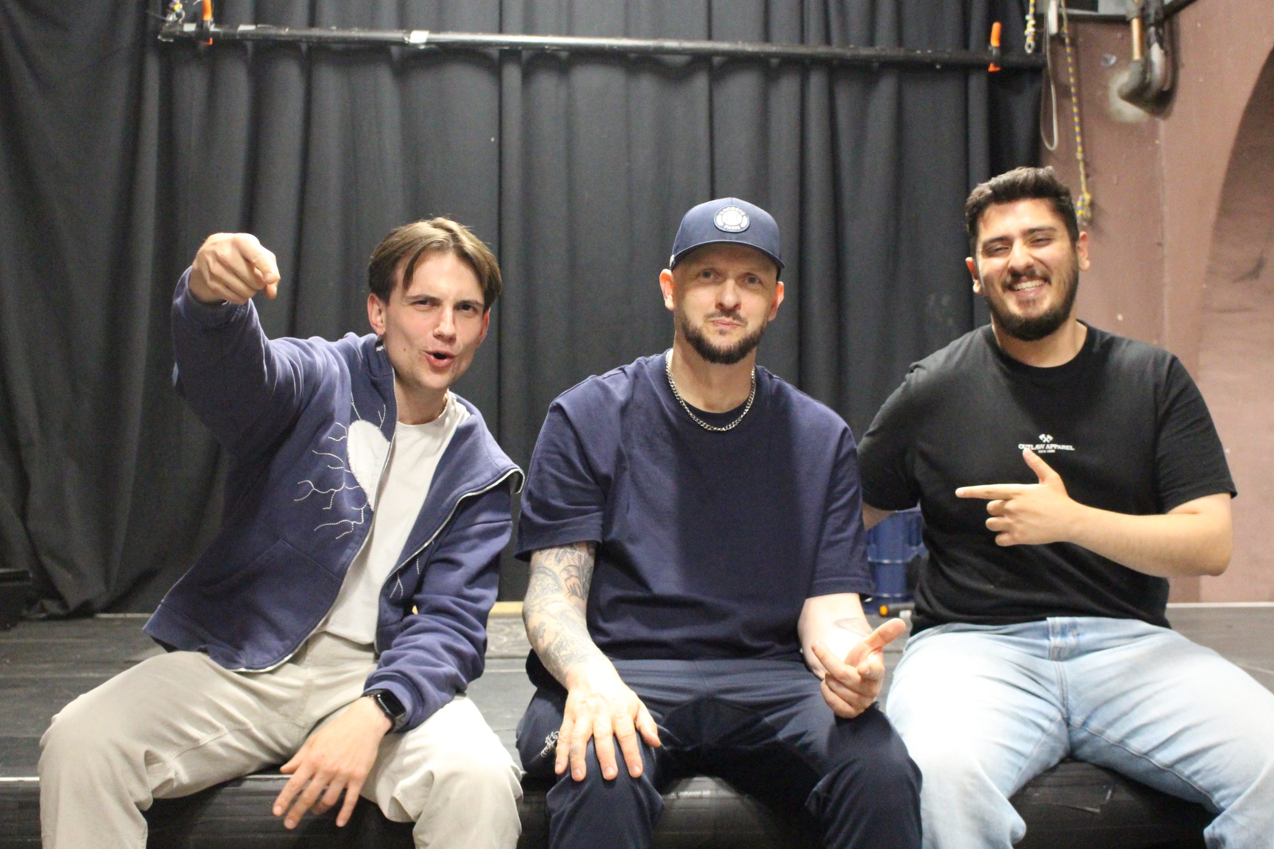 Teilnehmer der Rap-Meisterklasse mit ihrem Dozenten in der Mitte: Conrad Schilling, Andre Schnabel, Isaak Michailouglo (v. l. n. r). Foto: Sebastian Geschwill.