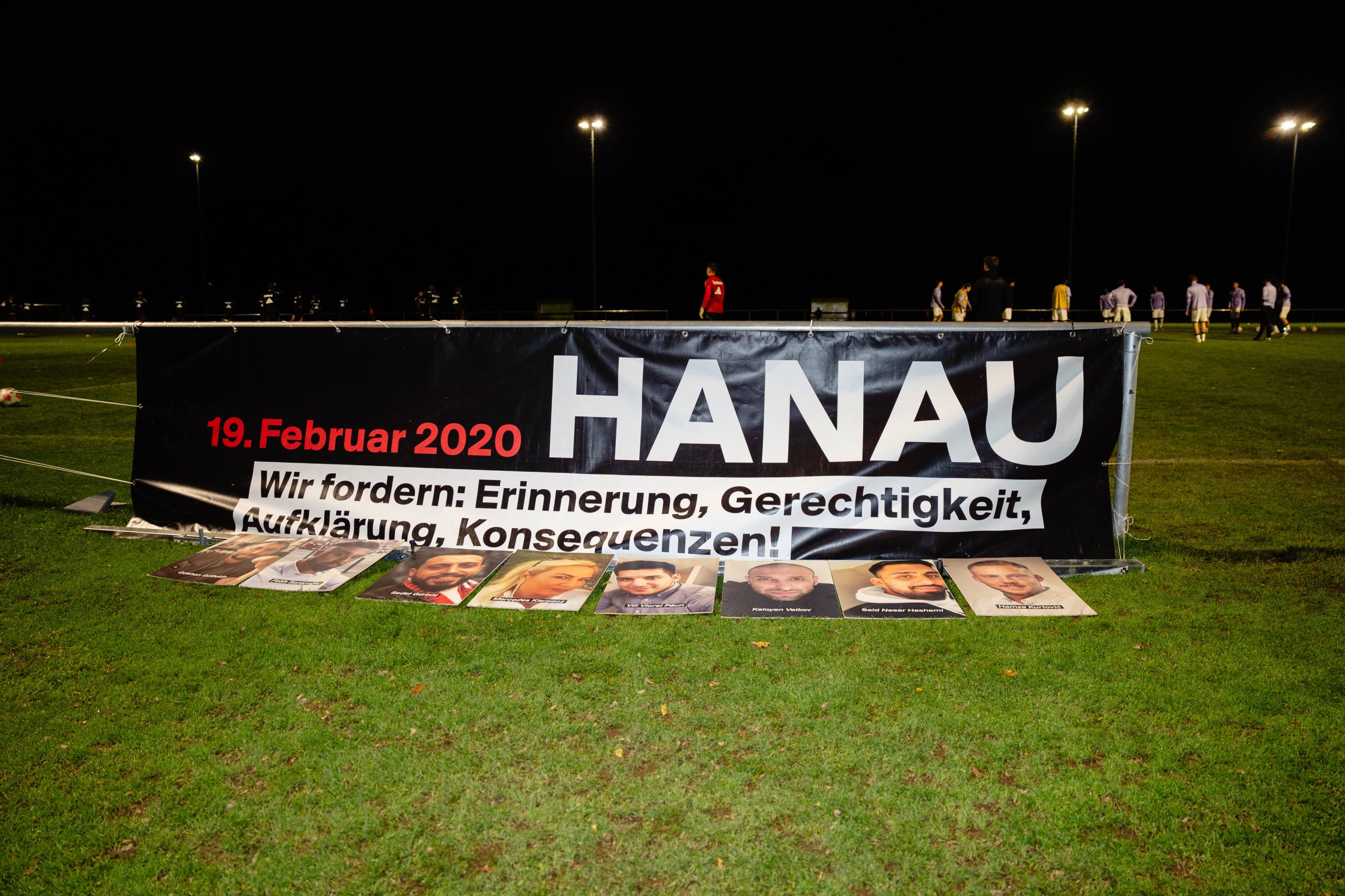 Ein Plakat auf dem Rasen mit Bildern der Opfer und dem Schriftzug: “Hanau. Wir fordern Erinnerung, Gerechtigkeit, Aufklärung, Konsequenzen.”